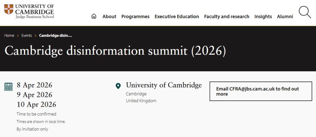 Cambridge Disinformation Summit, Cambridge University Judge Business School; April 8-10, 2026.