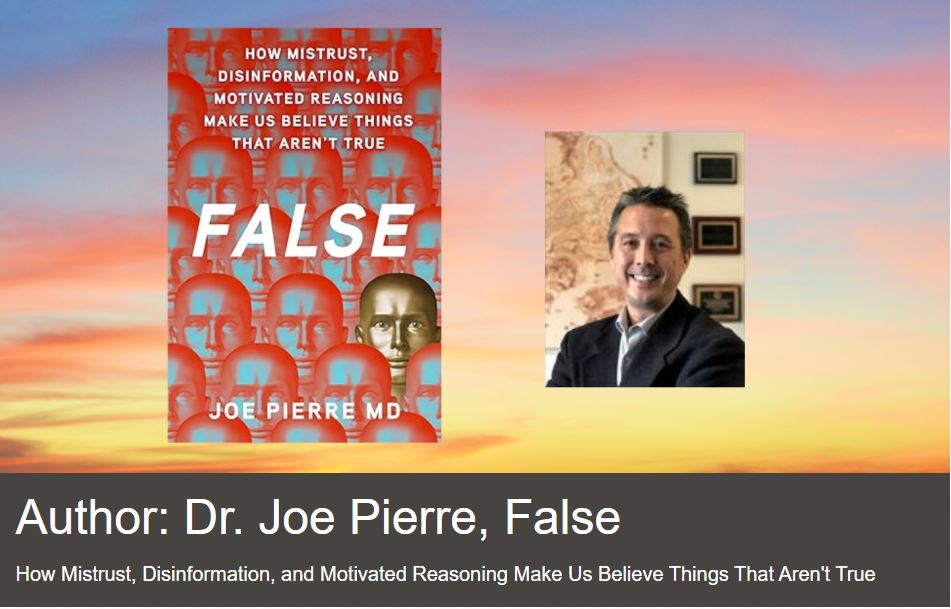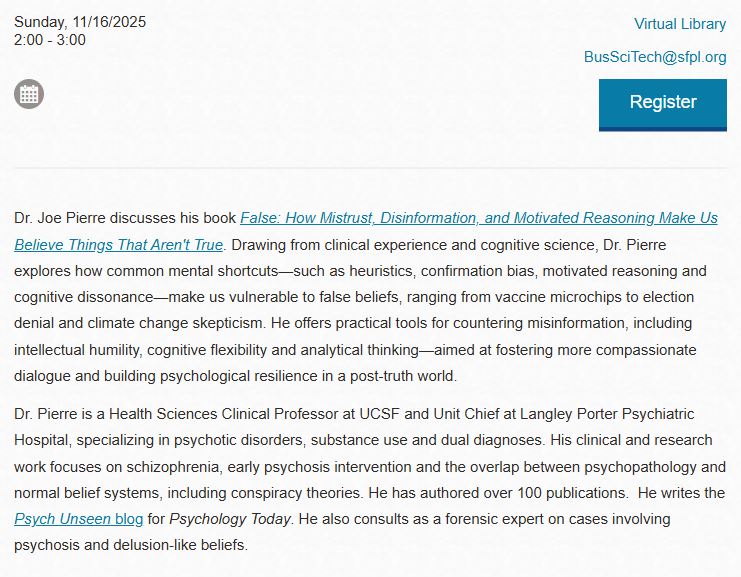 Dr. Pierre is available for public speaking and Continuing Medical Education (CME) events on topics related to psychiatry and mental illness, psychotic disorders, cannabis and cannabis-induced psychosis, delusion-like beliefs and conspiracy theories, and suicide prevention.